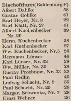 Bischofthum hatte demnach 1925 ca. 31 Wohnhäuser, während in den in der linken Spalte angeführten Adressbüchern (Quellen [2] bis [4]) nur 26 Hofbesitzer nachgewiesen und nachstehend tabellarisch genannt sind und 1944/45 nach der Aussage von Zeitzeugen 36 Grundstücks-Besitzer bzw. -Eigentümer gab.